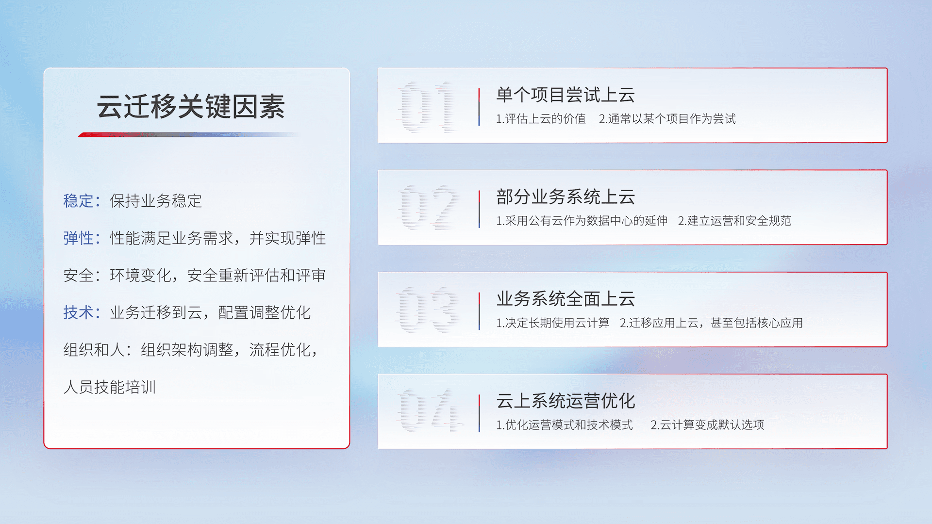 结合实际业务,,从规划设计、、、云平台选型、、云原生改造、、、、数据迁移、、、、集成交付,,迁移全过程为客户识别最佳上云路径,,,,做好风险识别管理,,,,设计网络架构、、、、身份权限、、、安全审计合规、、操作审计、、、、日志审计、、监控告警策略、、、、多站点容灾设计等,,,对云上基础设施进行整体规划,,,,提升IT治理水平,,,以满足弹性、、高可用、、、、高性能的需求。。
